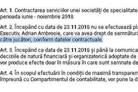 Art. 2. Începând cu data de 23.11.2018 nu se efectuează plăți de către club, decât cu acordul Președintelui Executiv, Adrian Ambrosie, care va avea drept de semnătură, alături de Directorul general. Excepție fac plățile către jucători, conform datelor contractuale.