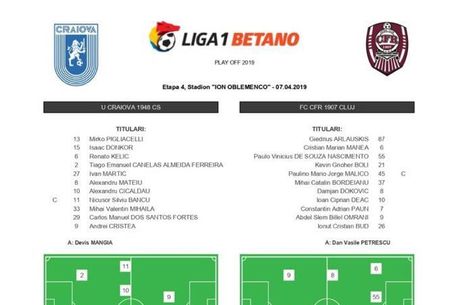 • Craiova: Pigliacelli – Donkor,    Kelic, Tiago Ferreira – Martic, Mateiu, Cicâldău,    Bancu (cpt.) – Mihăilă – Fortes, A. Cristea