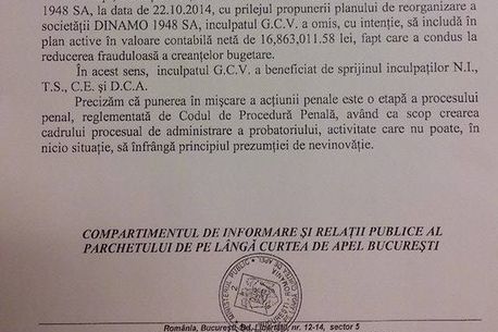 Din descoperirile făcute de procurori reiese că administratorul special desemnat pentru a reorganiza clubul Dinamo a avut complicitatea lui Negoiță, dar și a altor trei persoane, pentru a nu trece în contabilitatea clubului o sumă de bani, dar și pentru ca valoarea bunurilor să fie redusă cu aproape 18 milioane de lei.