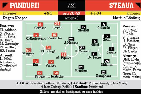 Cum “Dicanio” începea meciurile ca al doilea vârf, în spatele lui Pepe Moreno, această poziție va fi preluată de “matadorul” Dayro. “Ce facem dacă e suspendat Dică la Târgu Jiu? Dacă pleca în iarnă, ce se întâmpla? Pentru ce i-am luat pe Dayro Moreno, pe Mendoza? Poate evolua și pe benzile laterale, și în zona centrală oricare dintre ei”, a spus “Fiara”. Astfel, tehnicianul stelist va apela cu siguranță la dese schimbări de posturi între jucătorii ofensivi, mutări care s-au dovedit câștigătoare în derby-ul cu CFR Cluj. “Mișcare continuă la mijlocul terenului, asta e cheia jocului!”, a spus și peruanul Mendoza despre sistemul de joc al Stelei.