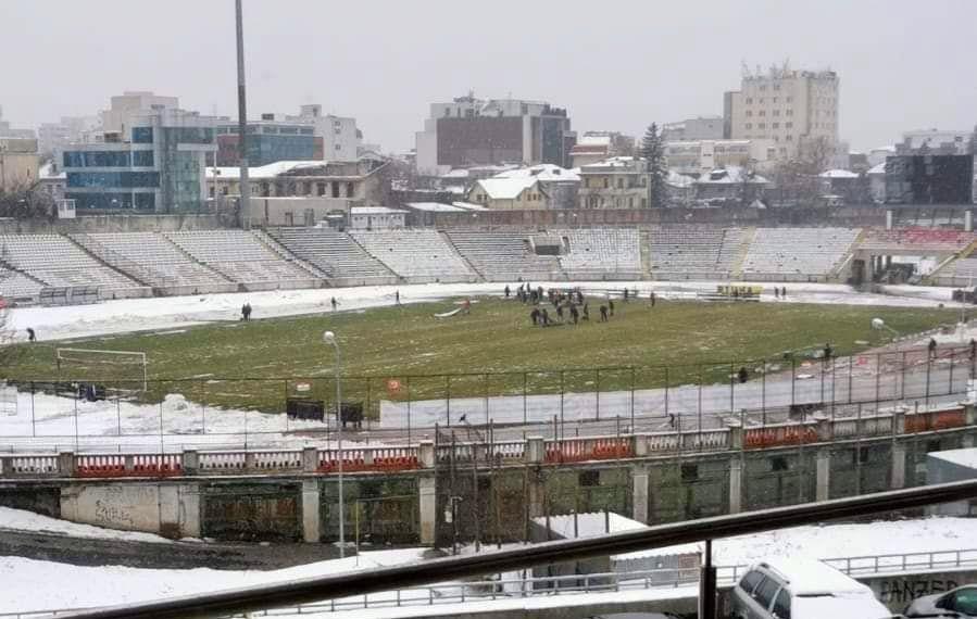 UPDATE 15:00: Suporterii lui Dinamo au făcut o treabă excelentă și, cu cinci ore înainte de meci, au deszăpezit terenul din „Ștefan cel Mare”.