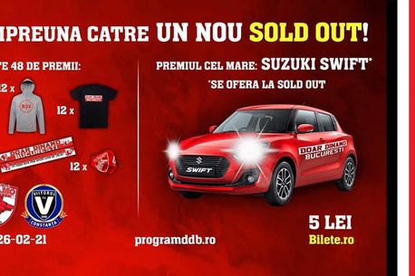Și acum surpriza tombolei DDB. MARELE PREMIU – UN AUTOTURISM SUZUKI SWIFT în valoare de 11.400 de Euro. Acest premiu va fi acordat prin tragere la sorți, doar dacă se realizează SOLD OUT! Istoria recentă ne spune însă că acesta nu este decât un detaliu, avem deja 3 pe Arena Națională și 5 în Ștefan cel Mare!” anunță suporterii dinamoviști pe pagina www.facebook.com/PeluzaCatalinHildan.
