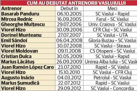 Concret, dacă Gigi Mulțescu, Viorel Hizo, Dorinel Munteanu, Emil Săndoi și Marius Șumudică au pornit la drum cu câte un egal, mai puțin norocoși au fost Basarab Panduru, Mircea Rednic, Marius Lăcătuș și Lopez Caro, toți patru trecându-și la capitolul debut o înfrângere. Singurii care l-au mulțumit pe patron încă din primul meci pe banca moldovenilor au fost Viorel Moldovan (CS Otopeni-Vaslui 0-2, 2008), Cristi Dulca (Vaslui-Rapid 1-0, 2009) și Augusto Inacio (Petrolul-Vaslui 1-2, 2012).