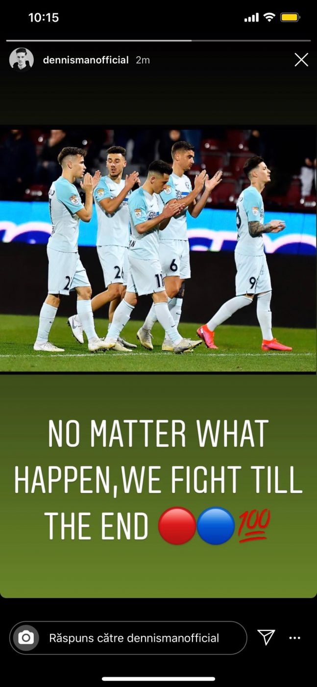 ”Indiferent de ceea ce se întâmplă, noi o să luptăm până la final”, a scris Dennis Man pe pagina sa de Instagram și a adăugat culorile echipei antrenate de Bogdan Argeș Vintilă.
