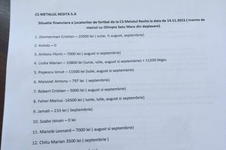 Szabo – banii la zi; jucătorii străini – aproape la zi, 200-300 de lei întârziere; Manole – două luni întârziere; Anițoiu – două luni; Robert Cristian – două luni; Zimmermann – 3 luni; Feher – 3 luni; Ionuț Popescu – 3 luni; Liuba – 4 luni