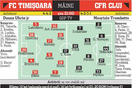Bănățenii mizează pe moralul scăzut al campionilor după eșecul de la Bordeaux. „Știm că ei vin după o înfrângere în Liga Campionilor și sper ca acest lucru să fie în avantajul nostru și să câștigăm. Nu mă tem de vreun jucător anume de la CFR. Au o echipă bună în toate compartimentele, însă și noi la fel”, a mărturisit portarul Costel Pantilimon.
