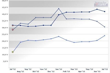 Steaua și Petrolul deschid sezonul cu un meci care le poate arăta suporterilor unde stau cele două echipe din punct de vedere al jocului pentru noul sezon. Cele două rivale vor fi însoțite, cel mai probabil, de CFR Cluj în lupta pentru titlu în 2013-2014. Steliștii primesc însă o veste excelentă chiar în ziua startului noului sezon. Conform celor de la transfermarkt.de, Steaua a „pus” cea mai mare diferență din istorie față de principalele rivale, din punct de vedere al valorii loturilor.