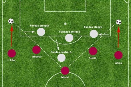 b) pasă către fundașii de viteză urcați în ofensivă. Una dintre cerințele importante pentru folosirea cu succes a sistemului cu număr 9 fals presupune existența în primul „11” a unor fundași de bandă cu apetit ofensiv. Adică ceea ce fac la FC Barcelona Dani Alves și Jordi Alba. În momentul în care falsul număr 9 a recepționat balonul în centru cu adversarul în marcaj, fundașii de bandă speculează spațiile lăsate pe laterale de mobilizarea în centru a liniei defensive adverse.