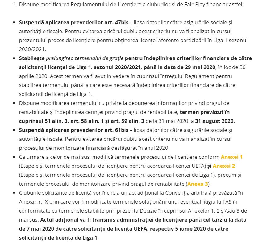 „Dispune suspendarea prevederilor art. 44 din Regulamentul privind condițiile de participare la Campionatul național Liga a 2-a. Pentru evitarea oricărui dubiu pentru participarea în sezonul 2020/2021 al Ligii a 2-a nu se va evalua condiția lipsei datoriilor financiare restante către asigurările sociale/autorităţile fiscale”, se arată pe site-ul oficial al FRF.