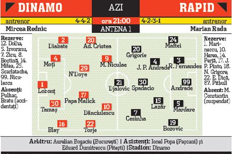 În condițiile în care Marius Niculae va fi titularizat totuși cu Rapidul alături de Dănciulescu, Niculescu va lua loc pe banca de rezerve. Claudiu a efectuat numai trei antrenamente la intensitate maximă din cauza unei accidentări la piciorul stâng, „culeasă” la Buzău, și urmează ca diseară să intre pe teren în funcție de evoluția scorului.
