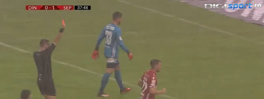 MIN 38. Gafă uriașă în apărarea lui Sepsi. Tincu îl trage în de tricou pe Fabbrini și Dinamo primește lovitură de la 11 metri. Cartonaș roșu pentru fundașul oaspeților.