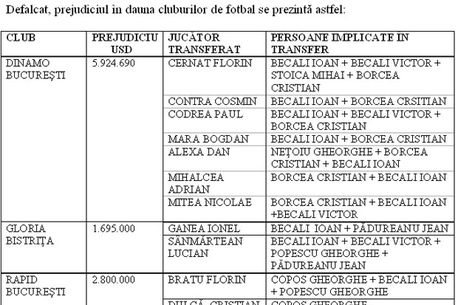 Procurorii din cadrul Direcției Naționale Anticorupție au dispus trimiterea în judecată a opt inculpați în legătură cu efectuarea de tranzacții ilegale la transferurile unor fotbaliști către cluburi din străinătate, fapte care au provocat un prejudiciu total de aproape 1,5 milioane USD în dauna statului și de peste 10 milioane USD în dauna a patru cluburi de fotbal. O parte din banii obținuți din transferuri au fost spălați prin intermediul unor firme off-shore. Astfel, au fost trimiși în judecată următorii: