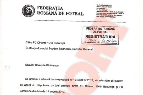 Repetăm ceea ce este corect și fără dubii: partida Dinamo – FC Barcelona se va juca la data stabilită, 11 august 2012, ora 20.15, cluburile Dinamo și Rapid s-au înțeles pentru amînarea meciului din campionat, federațiile de fotbal din România, respectiv Spania sunt înștiințate și și-au dat acordul pentru meciul amical – in atasament aveti scrisorile federațiilor în original – Dinamo și FC Barcelona vor juca întîlnirea amicală cu echipele de bază.
