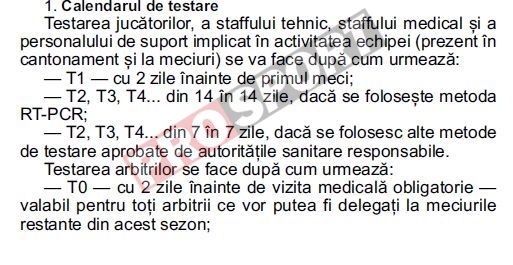 „Testarea jucătorilor, a staffului tehnic, staffului medical și a personalului de suport implicat în activitatea echipei (prezent în cantonament și la meciuri) se va face după cum urmează: