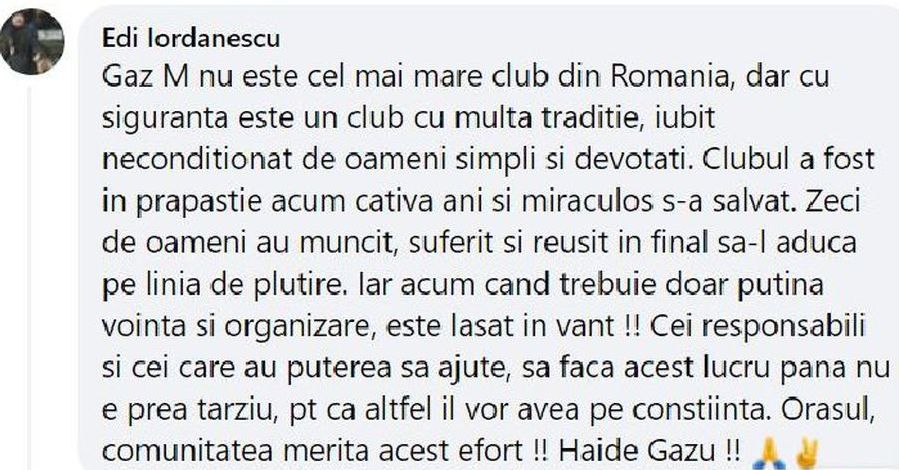Zeci de oameni au muncit, suferit și reusit în final să-l aduca pe linia de plutire. Iar acum, când trebuie doar puțină voință și organizare, este lăsat în vânt!! Cei responsabili și cei care au puterea să ajute să facă acest lucru până nu e prea târziu, pentru că altfel îl vor avea pe conștiință. Orașul, comunitatea merită acest efort! Haide Gazul!”, a fost mesajul lui Edi Iordănescu.