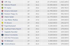 Mai mult de atât, Steaua este însoțită în topul echipelor a căror medie a cotelor este peste 1 milion de euro doar de alte două echipe: Astra Giurgiu, care a depășit în ultimul timp media valorii celor de la CFR Cluj.