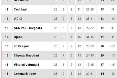 • Nouă echipe luptă pentru evitarea celor trei poziții care duc în liga secundă. Corona Brașov se află pe ultimul loc, fără nicio șansă de salvare