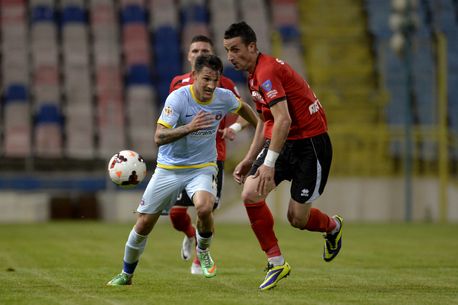 Momcilovic (în roșu-negru) în duel cu Gabi Matei, unul dintre puținele transferuri pe axa Pandurii – Steaua care nu au dat randamentul scontat. Foto: Mediafax