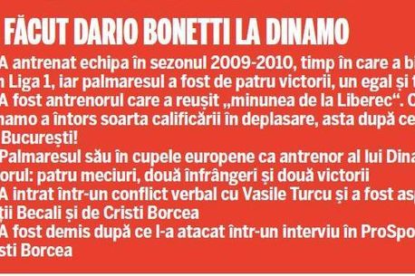Unul dintre cei vizați este Dario Bonetti, fostul antrenor al „câinilor” din 2009, cel care se afla pe banca lui Dinamo la „minunea de la Liberec”. Aceleași surse apropiate conducerii dinamoviste susțin că acesta va ajunge în cursul zilei de azi la București, unde se va întâlni cu Nicolae Badea și Dragoș Săvulescu.