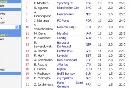 Grație celor 27 de goluri marcate, Valskis a intrat în topul celor mai buni marcatori de pe continent, conform eurotopfoot.com (vezi tabelul de mai jos). Având avantajul că a jucat deja 32 de meciuri până acum (campionatul lituanian s-a încheiat recent), balticul se află într-o companie selectă a golgheterilor de pe continent! Diego Costa (Atletico Madrid -19 goluri), Suarez (Liverpool – 19 goluri) și Cristiano Ronaldo (Real Madrid – 17 goluri) sunt singurii fotbaliști care l-au depășit în clasamentul Ghetei de Aur. Datorită faptului că joacă într-un campionat mult mai puternic, cei enumerați mai sus au avantajul punctajului, golurile lor fiind înmulțite cu o cotă de doi, în timp ce ale lui Valskis se înmulțesc doar cu 1.