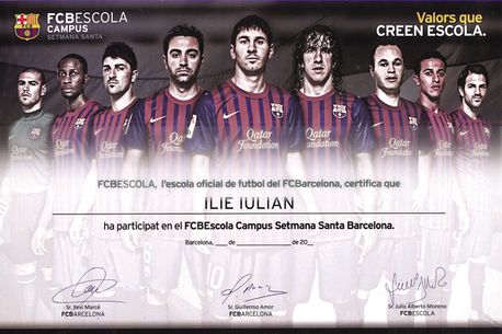 Așa arată diploma eliberată de Școala de Fotbal a Barcelonei lui Ilie Iulian, după ce puștiul a trecut cele două teste preliminare Foto: Colecție personală