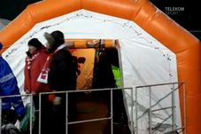 Jandarmeria a amenajat două corturi în care fanii dinamoviști au fost controlați pentru a se evita intrarea lor cu petarde și torțe pe stadionul din Giurgiu, conform TelekomSport.