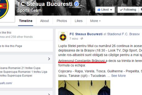 17:34 După o mică sincopă provocată cel mai probabil de funcția de AutoCorrect a telefonului, Steaua a anunțat pe contul oficial de Facebook echipa cu care va începe în această seară Constantin Brâncuși Gâlcă. Avem, așadar: