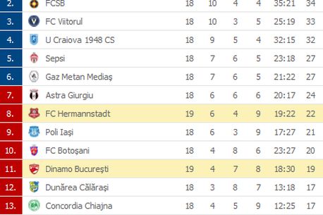 Dinamo e pe locul 11, cu 18 puncte, iar Hermannstadt e pe opt, cu 21 de puncte.