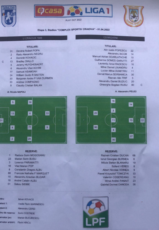 FC U Craiova și CS Mioveni s-au anihilat reciproc în etapa a treia a play-out-ului Ligii 1, scor 1-1.