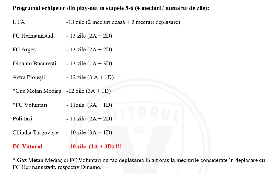 „FC Viitorul Constanța dorește să tragă un semnal de alarmă asupra modului în care s-a decis programarea meciurilor din etapele 3-6 ale play-out-ul Ligii 1, partide care în principiu vor stabili ierarhia echipelor retrogradabile și / sau participante la baraj.