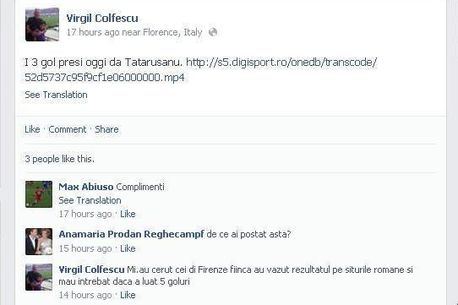 A explicat că Tătărușanu a încasat doar 3 goluri, nu 5 cum au crezut italienii. Postarea sa însă nu i-a picat deloc bine celei care susține că îl reprezintă pe stelist. „De ce ai făcut asta?”, a fost întrebat Colfescu. „Mi-au cerut cei de la Firenze pentru că au văzut rezultatul pe site-urile românești și m-au întrebat dacă a luat cinci goluri”, a venit răspunsul acestuia.