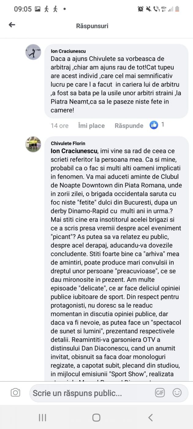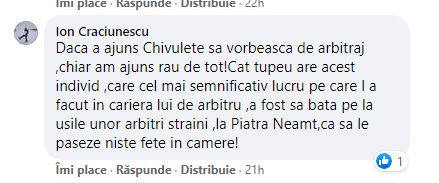 În grupul de Facebook „Școala de Arbitri”, unde foști cavaleri ai fluierului și pasionați de arbitraj schimbă idei, link-uri și informații, s-a declanșat o ceartă între Chivulete și Crăciunescu.