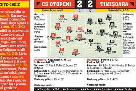 Balint a riscat tot și n-a câștigat nimic. Sau aproape nimic, pentru că punctul nu l-a bucurat nici măcar pe el. Salvată cât de cât pe moment, Timișoara nu are deocamdată perspective. Cu pretenții la titlu, bănățenii nu puteau veni decât cu pretenții și la Ploiești. Că doar nu era să se-mpiedice de-un Otopeni. Balint a investit totul în ofensivă: 4-3-3 curajos, dar și curios. Cele două ocazii din start păreau a-i da dreptate. Ce s-a întâmplat însă după golul lui Caramarin a semănat cu prăbușirea bursei. Și era doar primul sfert de oră. Când Bucur nu mai are nicio ocazie, Karamyan sau Bădoi nu mai dau nicio centrare, e clar că ceva e putred. Să fie titularizarea lui Curtean pe stânga, care l-a mutat pe Karamyan de pe postul său nativ? Sau „exilarea" lui Bucur undeva în lateral, unde mai degrabă trebuie să dea pase de gol decât să fructifice? Pare stricată ordinea lucrurilor. Așa că la următoarea greșeală a apărării e deja 2-0. „Jocul nostru nu convinge, dar e practicat de atât timp, că e greu să-l schimbi. Arătăm de multe ori ca o echipă mediocră. E și vina mea, știu că sunt contestat, e de înțeles, trebuie să găsesc soluții", afirmă lucid Balint după meci. Dar și în timpul lui antrenorul vede punctele moarte: Curtean, inexistent, înlocuit la pauză. Apoi Bucur, schimbat cu Parks, care dă două goluri. Un pic de inspirație, un dram de noroc, dar atât! Din partea jucătorilor, nimic! Zero! Nada! Doar greșeli de curtea școlii, centrări aiurea, șuturi obosite. Roșianu își pune cap