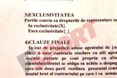 „În caz de prejudicii aduse agentului de jucători (între care se include și semnarea de către client a unor contracte similare cu alți agenți, chiar dacă nu sunt urmate de transferuri sau discuții purtate pe cont propriu cu alte cluburi legate de eventuale transferuri ale clientului) clientul se obligă să achite o despăgubire în valoare de o sută mii euro. În situația în care cele două părți reziliază prezentul contract, jucătorul se obligă să achite zece la sută din totalul brut al contractului pe care îl va semna ulterior fără asistența managerului … [n.r. – numele impresarului]. De asemenea, agentul se obligă să achite zece la sută din valoarea contractului în cazul denunțării unilaterale a prezentului contract„. Practic, în două cazuri din trei, fotbalistul plătește, inclusiv dacă rezilierea este de comun acord!
