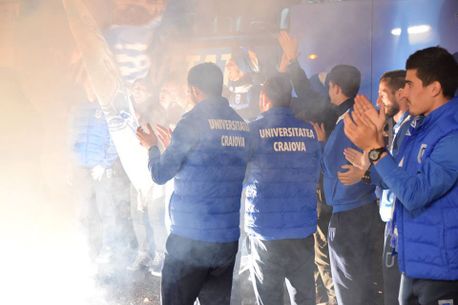 Un grup de suporteri ai Universității Craiova i-au așteptat azi-noapte pe jucătorii lui Gigi Mulțescu pe Aeroportul „Henri Coandă” din București, la sosirea delegației Științei din stagiul de pregătire din Malta. Fanii i-au felicitat pe alb-albaștri pentru rezultatele din cantonament și le-au smuls promisiunea că la finalul acestui sezon un trofeu va ajunge în Bănie. Suporterii au aprins torțe și au cântat împreună cu jucătorii lângă autocarul care-i aștepta pe aceștia pentru a-i duce la Craiova.