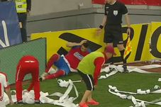 Ionel Dănciulesc a mers și el la galerie și a încercat să-i liniștească pe suporteri. În zadar. La reluare, tot în colțul terenului, Boldrin a fost lovit în cap de o brichetă și de o rolă de hârtie. Mijlocașul brazilian s-a prăbușit din nou, însă arbitrii n-au mai intervenit de această dată.