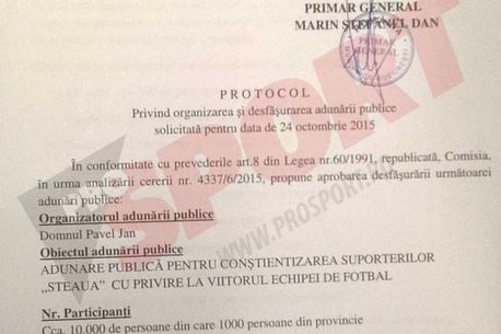 Fostul lider al galeriei Stelei, Jan Pavel, s-a ocupat de organizarea mitingului și a obținut aprobarea necesară din partea Primăriei București (click pentru detalii), astfel că adunarea va avea loc între orele 14:00 și 17:00, în ciuda afirmațiilor făcute de Gigi Becali într-o conferință de presă, în care patronul FCSB preciza că mitingul este ilegal.