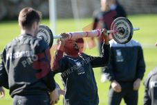 Primii care au lucrat cu halterele ce cântăreau 30 de kilograme au fost fundașii și cei din compartimentul ofensiv. Exercițiul consta în ridicarea halterei de la pământ în aer, cu un stop pentru o poziție intermediară, iar steliștii trebuiau să facă cât mai multe repetări într-un interval de 30 de secunde. Deloc surprinzător, cel mai bine s-a descurcat Iasmin Latovlevici, fotbalist recunoscut pentru calitățile fizice impresionante. Fundașul stânga a reușit și recordul zilei, cu nouă repetări în intervalul de 30 de secunde.