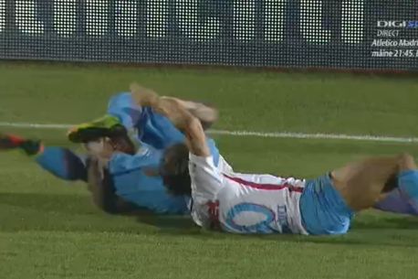 Fază curioasă în minutul 38 al partidei FC Voluntari – FCSB. La o acțiune de atac pozițional a oaspeților, Felipe Teixeira și Denis Alibec au fost faultați consecutiv de Pîrcălabu și de Filipov. Cei doi jucători ai lui Nicolae Dică au căzut unul lângă celălalt, iar felul în care Alibec a încercat să dea amploare faultului suferit l-a afectat, la propriu, pe colegul său.