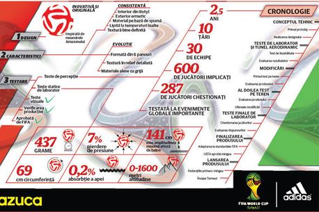 Mingea are dungi roșii, albastre și verzi pe fond alb, cântărește 437 de grame și a fost testată pe parcursul a doi ani și jumătate de 600 de jucători de la 30 de echipe din întreaga lume. Numele balonului a fost ales în septembrie 2012, într-un sondaj pe internet la care au participat un milion de fani brazilieni. Aceștia au avut de ales între „Brazuca”, „Bossa Nova” și „Carvanalesca”. „Brazuca” succede balonului „Jabulani”, folosit la Cupa Mondială din Africa de Sud, din 2012.