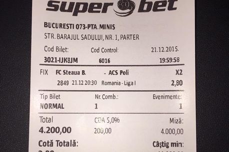Un român a vrut să dea lovitura la pariuri, dar a preferat o metodă foarte riscantă. Acesta a pariat nu mai puțin de 4.200 de lei pe X2, însă șansa nu i-a surâs. Steaua s-a impus cu 3-1, grație golurilor marcate de Bocșan (autogol 33), Nicușor Stanciu (48) și Hamroun (80), respectiv Dan Popescu (83).