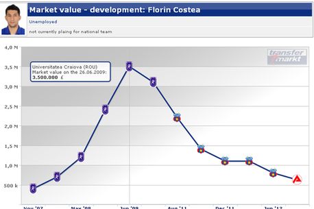 Graficul decăderii lui Florin Costea – în trei ani cota sa a scăzut de la 3,5 milioane – cel mai scump jucător la ora respectivă din Liga 1 – la aproximativ 600.000 de euro