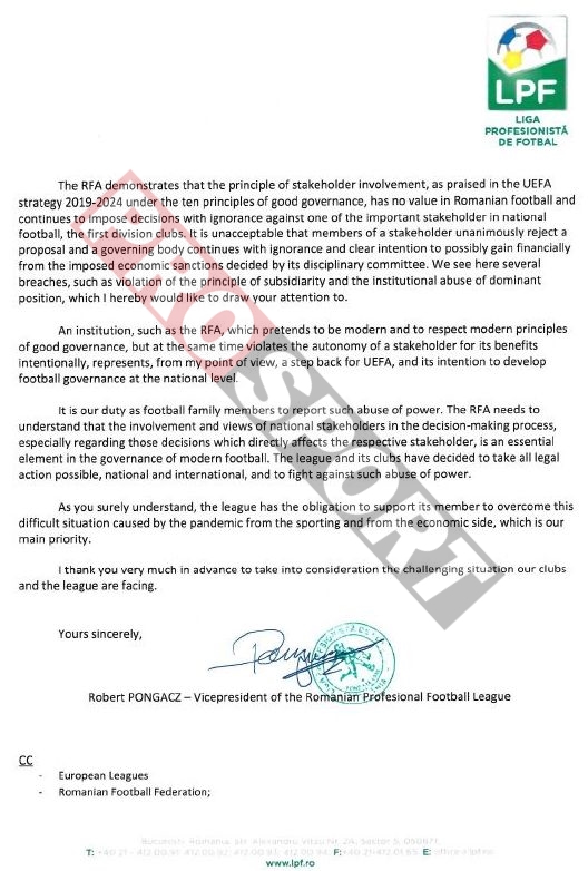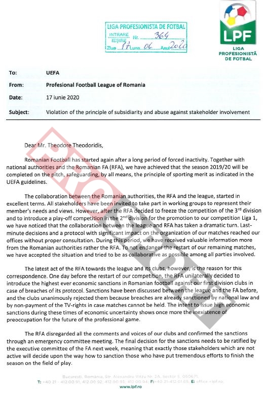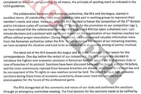 Intenția de a emite astfel de sancțiuni în timpul acestei perioade incerte din punct de vedere financiar arată din nou inexistența preocupării pentru viitorul fotbalului profesionist. FRF a ignorat vocea cluburilor noastre și a implementat sancțiunile printr-o întâlnire a Comitetului de Urgență”, se arată în scrisoarea trimisă de către LPF la UEFA.
