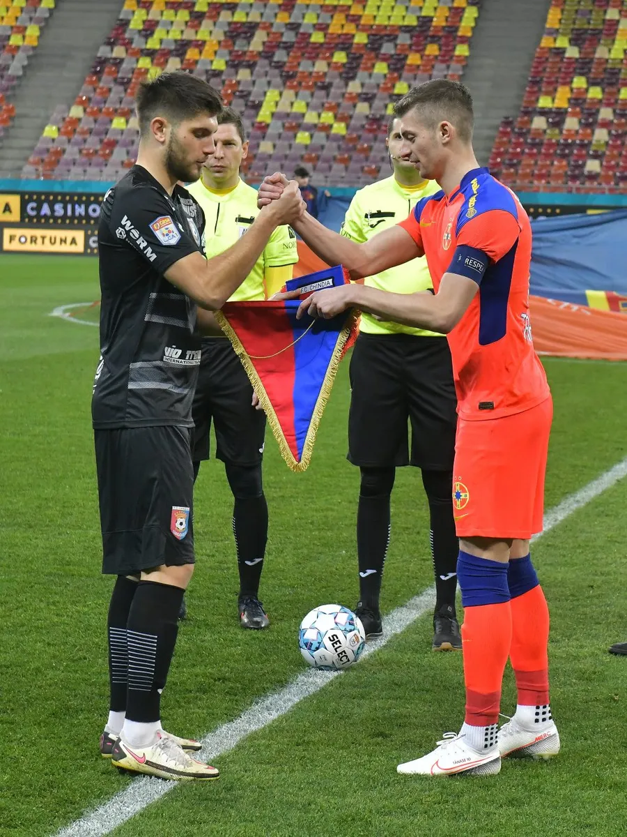 Capitanii Paul Alexandru Iacob si Florin Lucian Tanase la traditionalul schimb de fanioane la meciul de fotbal dintre FCSB si Chindia Targoviste, contand pentru Liga 1 Casa Pariurilor, desfasurat pe Arena Nationala din Bucuresti, duminica 13 februarie 2022. © FOTO:Razvan Pasarica/SPORT PICTURES