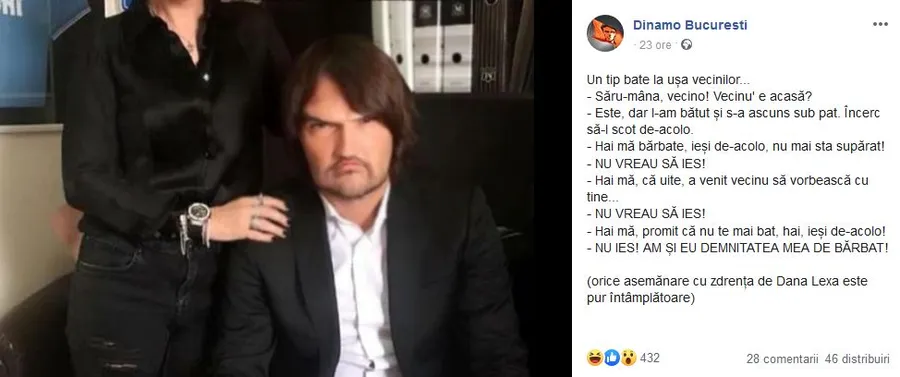 (orice asemănare cu zdrența de Dana Lexa este pur întâmplătoare)”, e mesajul postat pe pagina galeriei dinamoviste, PCH, preluat de pe contul Dinamo București.