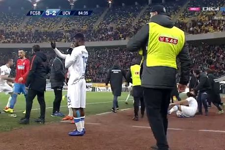 Rămas în zece oameni după eliminarea lui Renato Kelic, Devis Mangia se pregătea să-i trimită în teren pe Donkor și Carlos Fortes, iar Marius Briceag era desemnat să execute o lovitură de la margine. Aflat în zonă, Man a intrat într-un mic conflict cu Briceag, iar faptul că acesta s-a produs în apropierea băncii de rezerve a oltenilor l-a amplificat teribil.