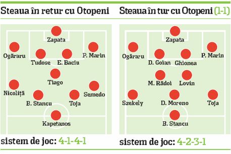 Un semn de întrebare poate fi pus și în dreptul lui Bănel Nicoliță, care și-a ispășit etapa de suspendare, dar se resimte încă după o lovitură încasată în timpul meciului cu Gaz Metan Mediaș. De altfel, „Jardel” nu s-a putut pregăti la capacitate maximă în această săptămână, dar este de așteptat ca internaționalul român să poată fi recuperat până la ora partidei. Mai mult ca sigur, postul de mijlocaș stânga va fi ocupat de Antonio Semedo, portughezul urmând a reveni și el printre titulari după două etape în care, fost introdus pe teren numai din postura de rezervă. Din cauza faptului că are numai 18 jucători valizi, Marius Lăcătuș nu a mai trimis pe nimeni la Steaua II, care joacă astăzi, în deplasare, cu Viitorul Însurăței.