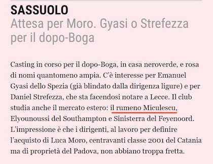 Însă, și „sirenele” din Il Calcio sunt tot mai tari când vine vorba despre David Miculescu. Sassuolo, echipă la care evoluează și Vlad Chiricheș, îi caută un înlocuitor, sau doi, lui Jeremie Boga, care s-a transferat la Atalanta pentru 22 de milioane de euro. Printre numele oferite chiar prestigioasa publicație Gazzetta dello Sport se află și cel al utistului Miculescu, pentru care „neroverdi” nu ar avea probleme să plătească între 1 milion și 1 milion și jumătate de euro.