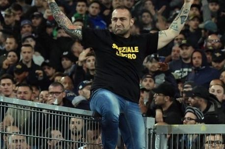 În imagine, liderul galeriei napoletane care a fost suspendat 5 ani după ce s-a afișat cu acest tricou la finala Cupei Italiei