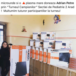 Ieri, aceasta a postat pe pagina personală de Instagram rezultatele evenimentului. „Șase televizoare, șase frigidere, șase cuptoare cu microunde și o plasmă mare donează Adrian Petre prin Turneul Campionilor Secției de Pediatrie 2 Arad. Mulțumim tuturor participanților la turneu”, a scris aceasta. Mesajul a fost preluat și de atacantul lui Esbjerg.